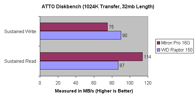 ATTO Diskbench is a widely known benchmarking tool to find specific holes in your file system and test the sustained read/write performance by having the capability to adjust different transfer sizes, as well as transfer lengths. For the read/write benchmark I chose to use a 1024K transfer size at a 32mb length. This stresses both drives to the max under read/write conditions. For once, the Raptor comes ahead of the Mtron unit in Write Performance. The Raptor has a 17% edge in write performance using SATA. But, again we see a confirmed sustained read of 114 MB/s on the Mtron unit confirming an additional 35% performance increase over the Raptor 150. NAND flash architecture on the Mtron unit is currently known for the most part to have either a slower or equal too write capability when compared to the Raptor 150. And this is widely known with current flash technology as well. We will begin to decipher the real write performance differences between these drives later on in this review.