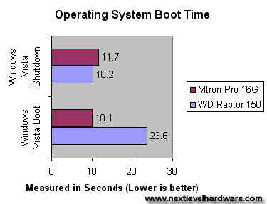 As you can see, the sheer access time on NAND Solid State, especially this Mtron drive totally dominates current rotating HDD technology. We are seeing a boot performance increase of 130% on the Mtron Unit over the WD Raptor. To show you how incredible fast this drive really is you can click on this movie link as I have taken a quick Vista Boot video here: http://www.nextlevelhardware.com/ssdnew.mpg