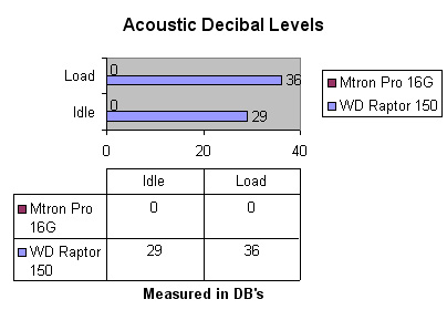 Another difference with these new Solid State Drives is SILENCE. Since you are using a non rotating device, as compared to a 10,000 RPM rotating Raptor, there is absolutely no noise using NAND Solid State Technology. The raptor produces an ugly 36 db's at full seek capacity and up to 48 decibels using other review domains testing procedure.