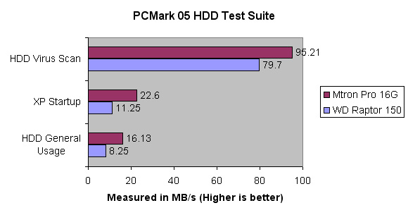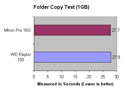 Again, here you can see a 50% increase in performance using the Mtron 16GB solid state unit. This is exactly what I was talking about. The operating system environment feels instantaneous. You initiate a file operation, and its done! We are not talking cheap competition either, we are comparing this drive to a Western Digital Raptor 150, the king of current SATA performance.