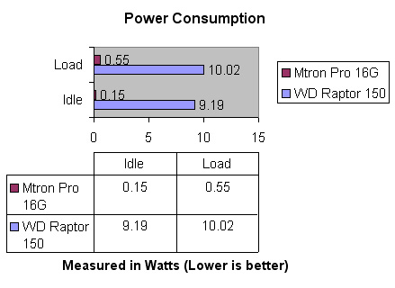Power consumption is another incredible feat with these Solid State Drives. The Mtron unit uses a maximum of 2.95 watts (update, chart correction) to power the drive compared to the 10 watts full seek load of the WD Raptor.