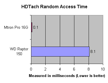 As you can see, the raw power of the Mtron Solid State Drive is apparent using HDTach. It displays an average read increase of almost 30 MB/s over the rotating "old fashioned :)" Raptor 150. And the most important number that you should be looking at right now, is random access time. NAND Solid State will increase the snappy feeling of random file reads by over 80 times faster than the WD Raptor 150.